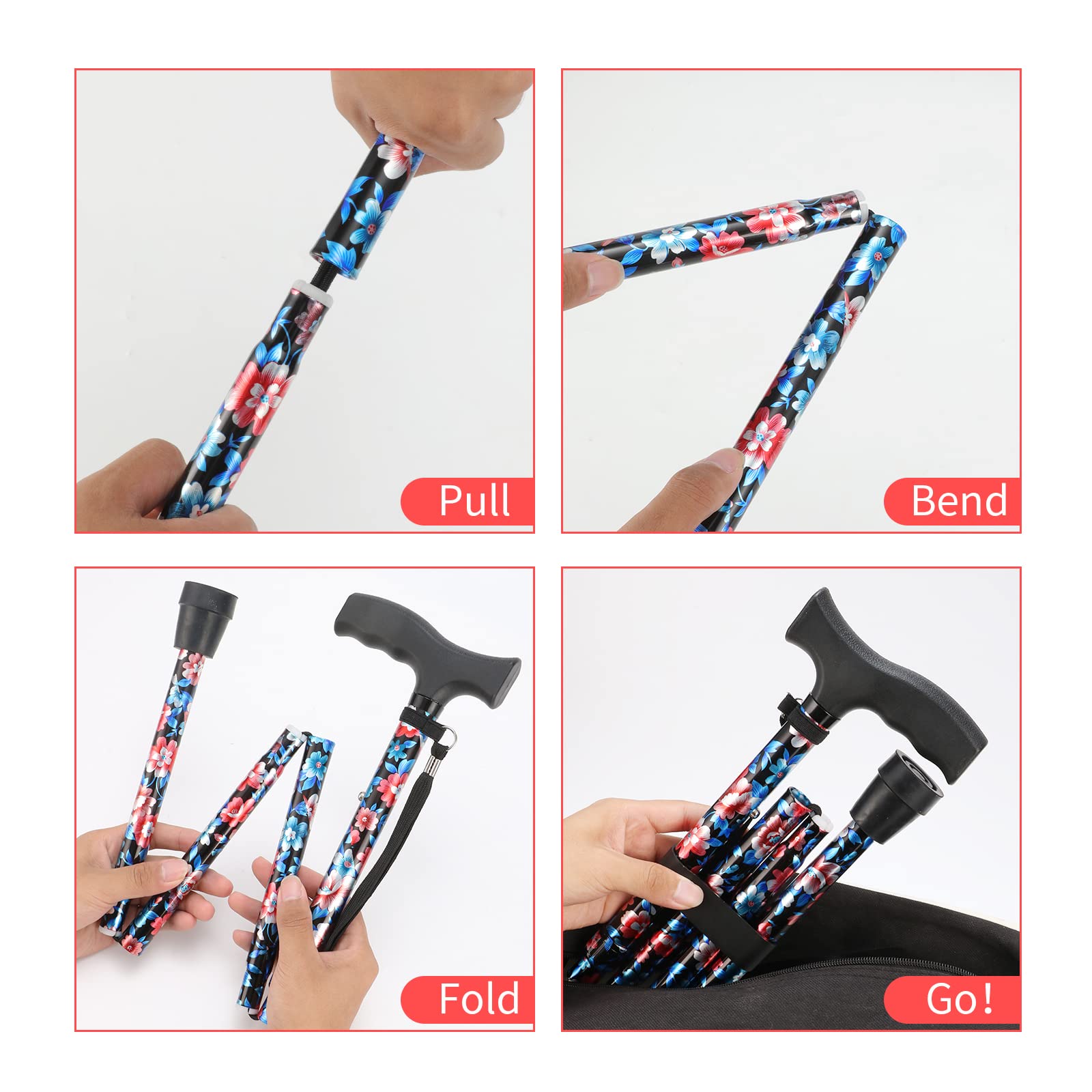 - â LIXIANG COLLAPSIBLE& COMPACT WALKING CANE - In order to provide a convenient option for those needing assistance, we develop this folding walking cane. It can smoothly and securely locks in place to provide extra stability while walking on any surface. Ergonomically-designed grip T-handle together provide users with maximum safety and comfort while exhibiting high quality and sustainability. This collapsible cane is compact, easily fitting into a purse, briefcase, carry on or wheelchair bag.